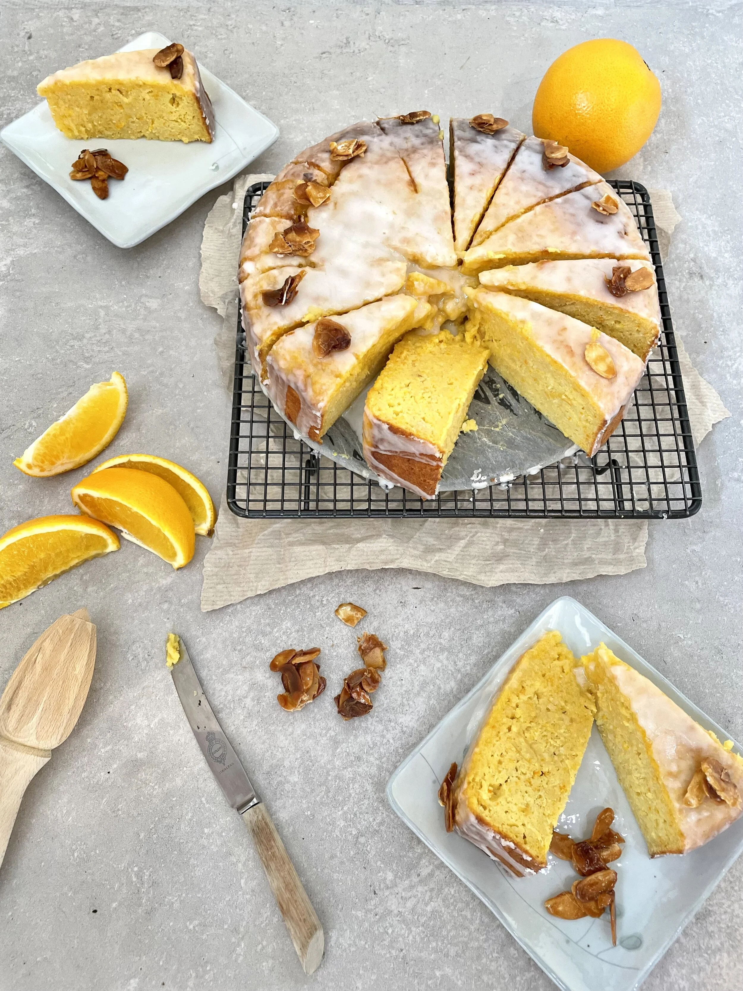 If icing, mix 125g icing sugar with juice of an orange and pour over and sprinkle over some toasted almonds.